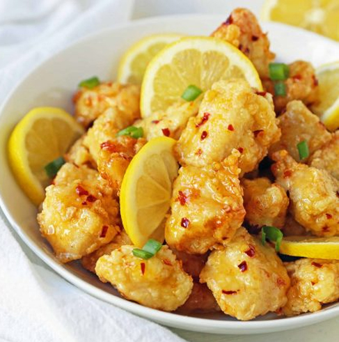 Boneless chicken, cooked in lemon juice and spices